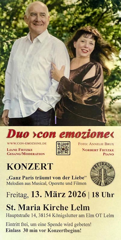 Das Duo ›con emozione‹, mit den beiden bekannten Künstlern Liane Fietzke (Sopran) und Norbert Fietzke (Piano), bietet den Konzertbesuchern ein tolles Programm mit LoveSongs aus Musicals, wie „Can-Can“, „Zauberer von Oz“, „Song and Dance“, „My Fair Lady“, „Sunset Boulevard“, „Phantom der Oper“, „Girl Crazy“, „Die Csárdásfürstin“, „Die lustige Witwe“ u. a. Das, gespickt, mit kurzweiligen Anekdoten zu den Inhalten oder den Machern des jeweiligen zu hörenden Stückes.